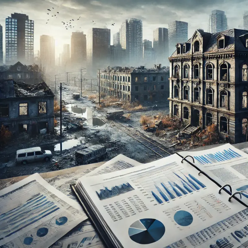 The image is reflecting the themes of real estate management issues and mismanagement. It visualizes the sense of decay and neglect in urban development, with a focus on abandoned buildings, financial mismanagement, and a distressed city skyline.