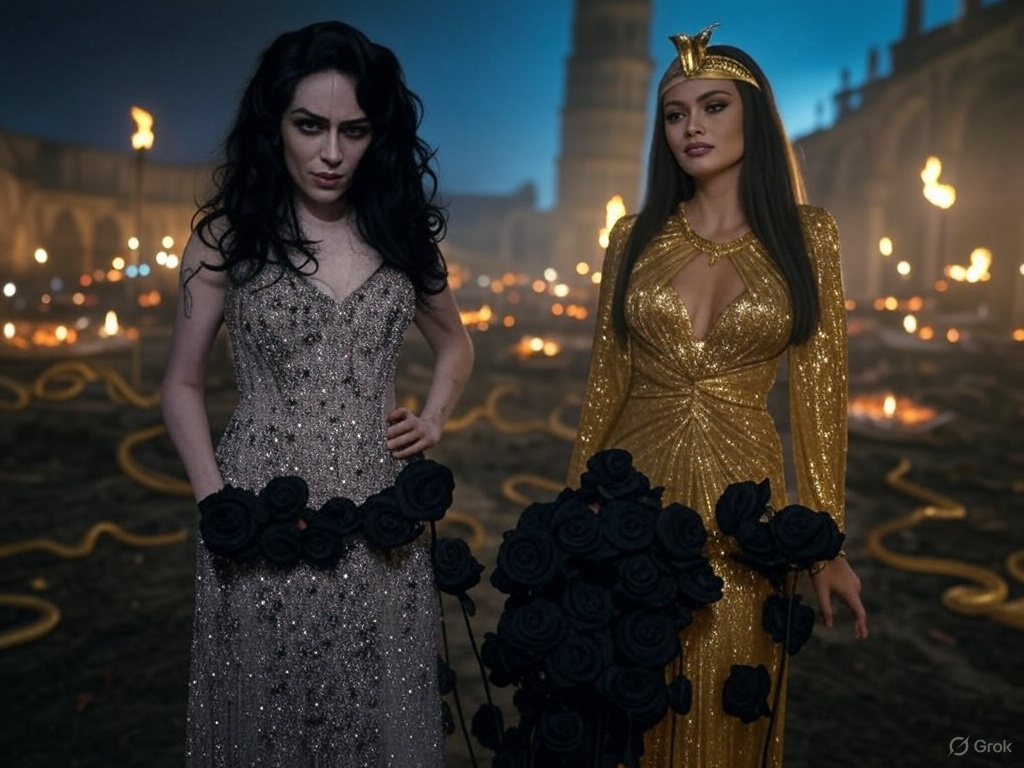 On the opulent Perverso set, the Rat Queen stands resolute amidst Cleopatra’s Venomous Masquerade, her tattered sequined gown glittering with defiance. Surrounded by black roses and her loyal rats, Janelle faces the seductive queen in her golden gown, as golden snakes and lotus pools spread venomous chaos. The Tower of Gay Pisa looms in the background, its erection-stink clashing with the scent of seduction! #Cleopatra #VenomousMasquerade #JanelleRebellion #PerversoChaos