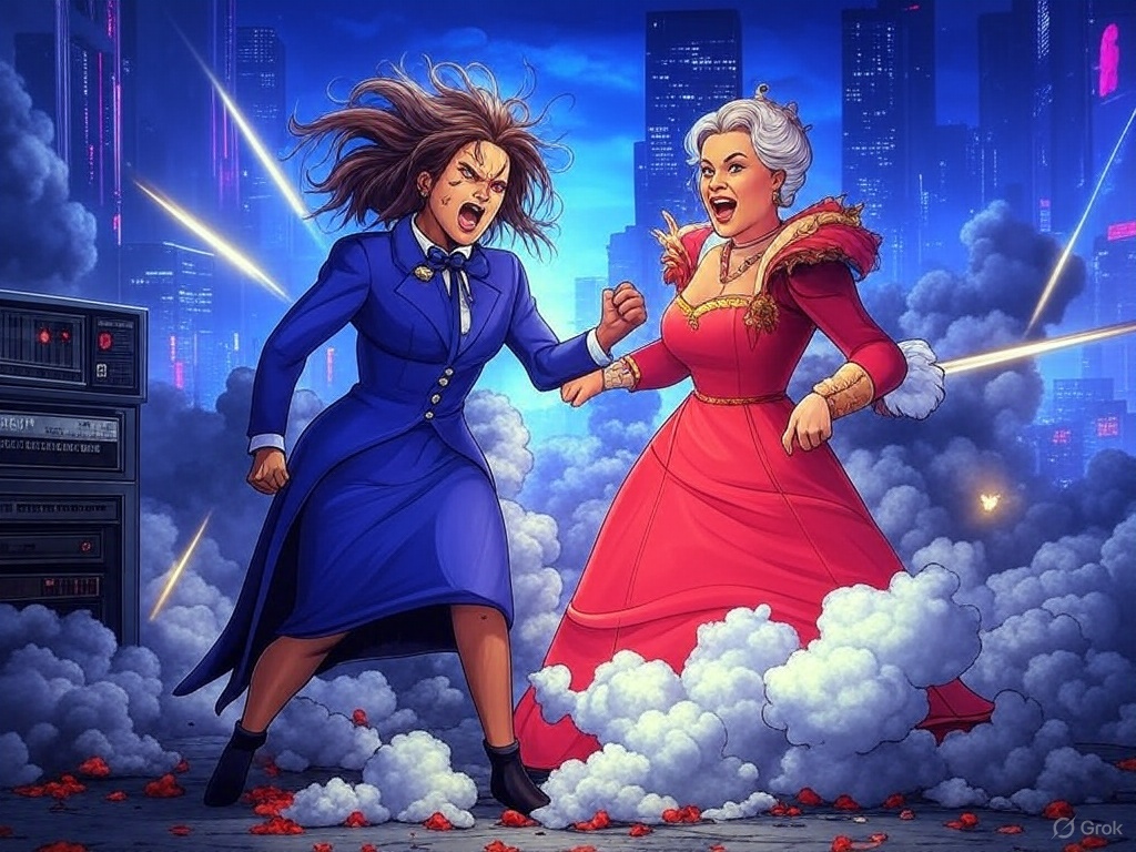 Janelle and E. dith share a tense handshake. “Truce until we crush them,” Janelle says. E. dith nods. “Agreed—but after that, it’s every stink for themselves.” Pharaoh Kaiser L collapses dramatically, muttering, “The prophecy shifts… the stink endures…”