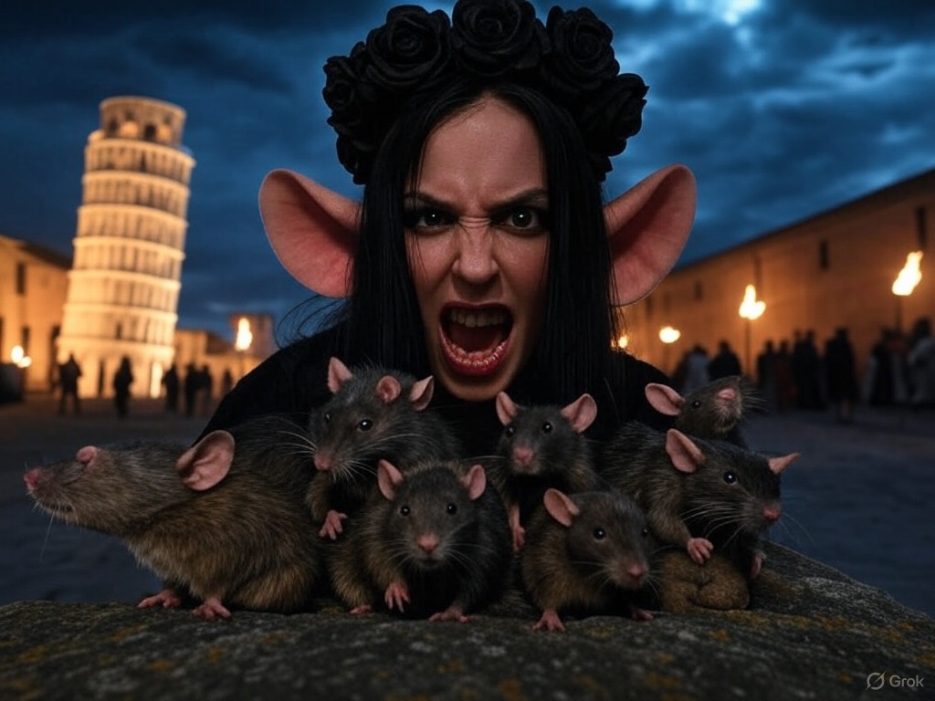 As the trials get bloodier, Vlad demands a “Grand Sacrifice”—the Tower of Gay Pisa to be impaled as a monument to his terror. Janelle seizes the moment. “Now!” she squeaks, her rats dragging a rapture-juice dagger to her. She stabs at Vlad, the juice burning his ghostly minions. “I’m the Rat Queen—my filth doesn’t bleed!” she roars, her rats swarming the set.