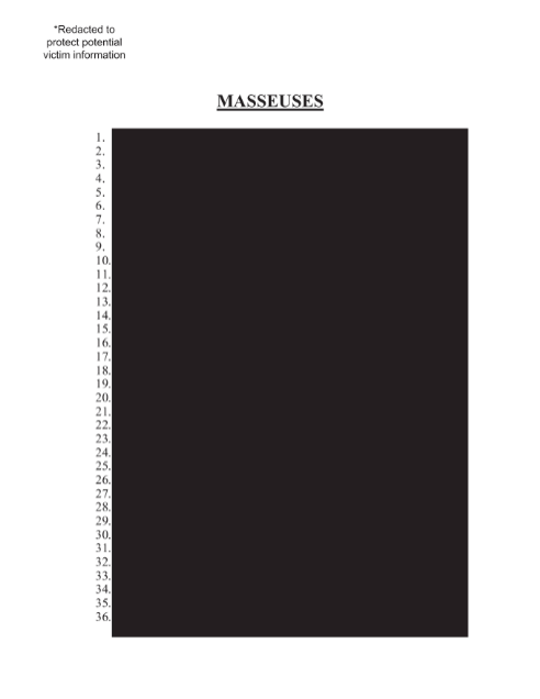 The release also includes a list of 254 individuals labeled as “MASSEUSES,” but their names have been redacted due to privacy concerns and ongoing investigations.