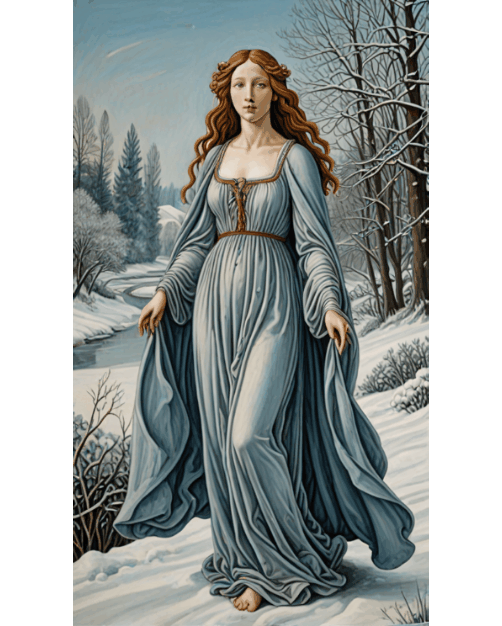 “Embodying the quiet beauty of winter, this Botticelli-inspired goddess stands amidst a serene, snow-covered landscape, reflecting solitude, wisdom, and timeless elegance.”