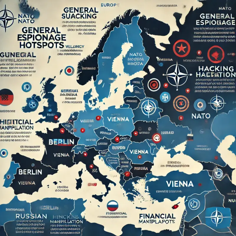 Here is the map showing espionage hotspots in Europe, highlighting key cities with generalized intelligence activities.
