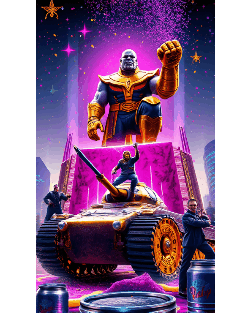 - Thanos looms in a neon-chiseled armor, roaring, “I AM… INEVITABLY FABULOUS.”