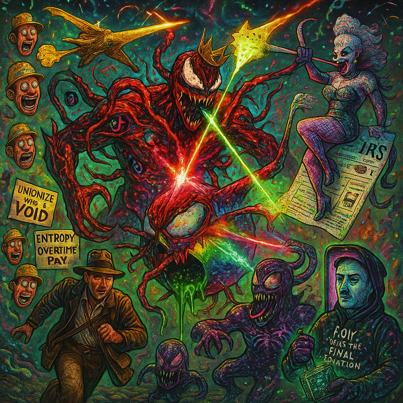 Carnage 🕷️🔪, a swirling mass of glittering symbiote tendrils ✨🕸️ and Chaos Coin runes 💰🔮, engulfs a Rainbow Death Star 🌈💀. Hinterhaeltige Janelle-Sauron 👑💍🐀 rides a cheese-coated X-Wing 🧀🚀, firing lactose lasers 🥛⚡ at Carnage’s core. Divine 👹💎 pole-dances on a sentient IRS form 📝💃, surrounded by Schizo-Petes 🌀🤪 protesting with “UNIONIZE THE VOID” signs 📢🌌. Indiana Jones 🎒🧔 flees Hitler’s TikTok ghost 💀📱 and a symbiote IRS audit 🕸️💸.