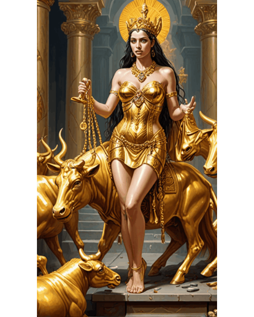 September 1, 2031 – Jezebel 👑🐍 (self-proclaimed “CEO of Idolatry”) crashes the multiverse with a cursed golden calf NFT 🐄💎, corrupting Perverso into a biblical corporate hellscape where: