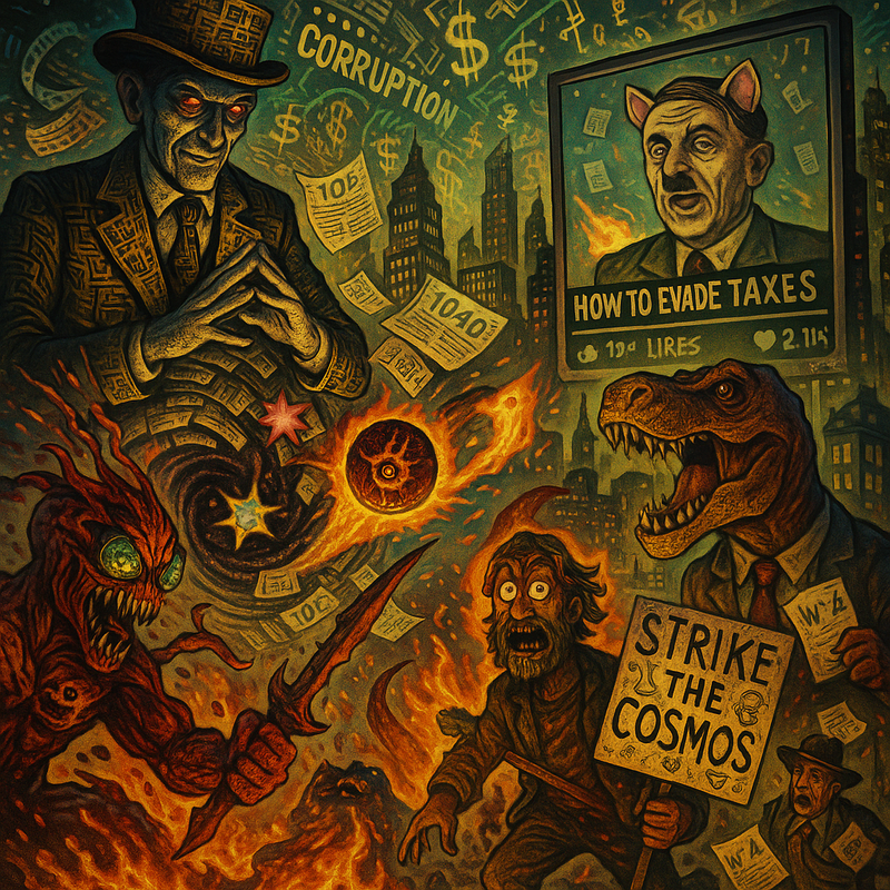 Style / Stil: H.R. Giger meets Terry Pratchett on a crypto bender – biomechanical tax forms, steampunk glitter, and neon-black-hole absurdism.