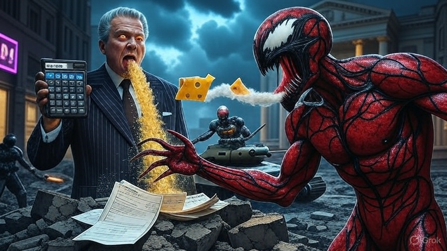 The Governor 🏛️⚔️, clad in a fascist pinstripe suit 👔⚔️ with a calculator scepter 🧮⚔️, stands atop a crumbling neoclassical bank 🏦💥 spewing glowing tax forms 📝✨. Carnage 🕷️🔪, now a cyborg-rebel 🤖🕸️ with ResistanceCoin eyes 💰👀, duels Janelle-Sauron 👑💍🐀 riding a cheese-armored tank 🧀🚜 firing raclette missiles 🧀🚀. Divine 👹💎 twirls on a golden stripper pole 🌟💃, surrounded by Schizo-Petes 🌀🤪 waving “UNIONIZE THE APOCALYPSE” signs 📢🌌. Indiana Jones 🎒🧔 flees Hitler’s AI hologram 💀🤖 and a T-Rex IRS auditor 🦖📝 juggling glowing W-2s 📄✨.
