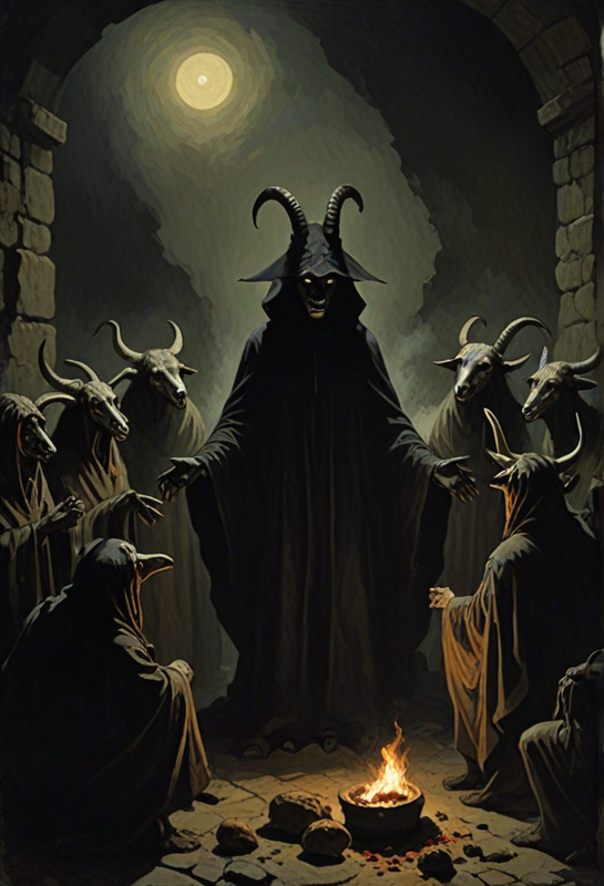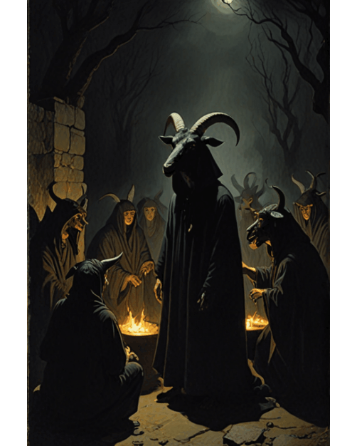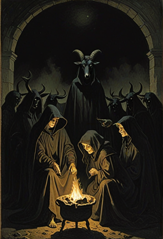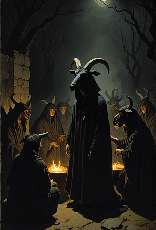 Francisco Goya, one of the most influential painters of the Romantic period, remains a defining figure in the artistic representation of the macabre and the supernatural. His work Witches’ Sabbath (1798) is a haunting depiction of a dark ritual led by a sinister black goat, believed to be the embodiment of the devil. This theme of occult gatherings and demonic ceremonies has inspired countless artists, filmmakers, and modern AI-generated art.