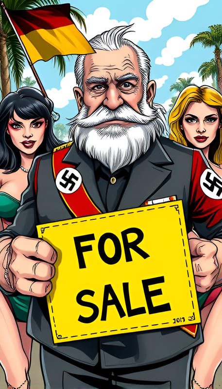 “Dr. Z: The self-proclaimed Aryan real estate revolutionary, caught in his natural habitatāholding a ‘For Sale’ sign, surrounded by Brazilian Escorts. A satirical take on absurdity, neonazi delusions, and the art of networking gone wrong.”