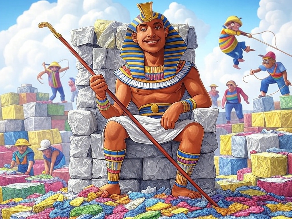 The headline blasts across Idiot Zeitung’s crumpled pages: “STINKBANDE BAUT ‘HEAVEN NOW’ – EIN WASTEPAPER-WUNDERLAND ÜBER DEN WOLKEN!!!” After their Great Stink Wall triumph, Pharaoh Kaiser L, atop a floating throne of soggy newspapers, waves his pharaoh staff—its grappling hook now tangled in crumpled Bank of China memos. His latest deranged dream? “Heaven Now,” a sky-high paradise built entirely from wastepaper, promising eternal stench and recycled relaxation for the Stinkbande and their imaginary flock.