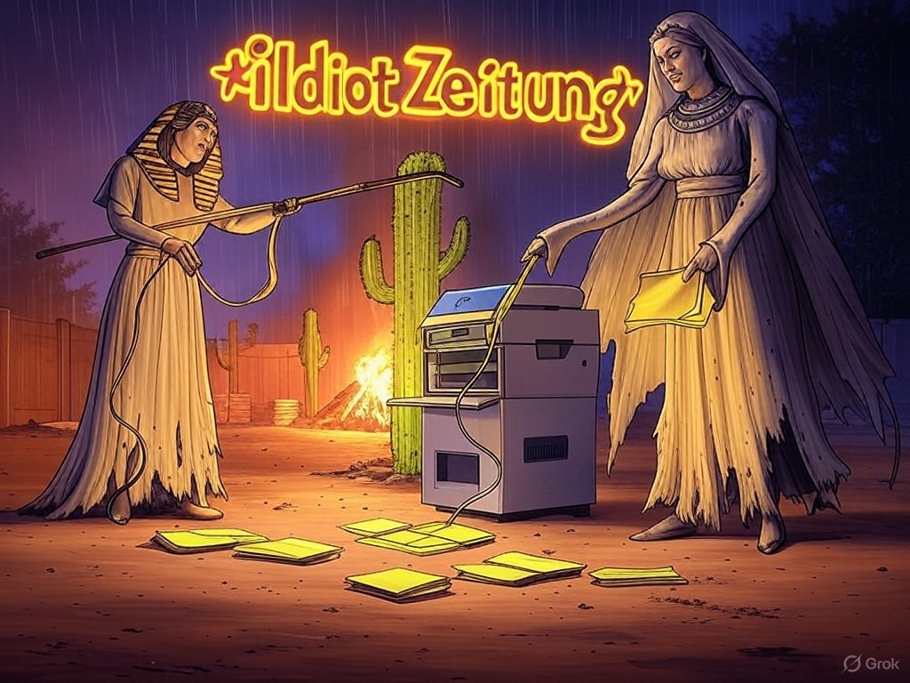 The headline blasts across Idiot Zeitung’s crumpled, ink-stained pages: “STINK HORIZONT ÜBERFLUTET FRANKFURT – 10.000 WASTEPAPER, 5.000 SOFORT ZERSTÖRT!!!” After the cosmic flop of Stink Odyssey, Pharaoh Kaiser L (Andreas) stands in a grimy Frankfurt backyard, his drooping staff—still tangled with Bank of China memos—now a printing press lever. His latest scheme? Printing 10,000 wastepaper “Horizont” ad sheets to flood the skies with Stinkbande propaganda, dreaming of ad revenue gold. E. dith von B.-Aumann-Stinkenstein, her nymphomania now aimed at salesmen, pushes the plan into overdrive—only for half the stash to meet a fiery end.
