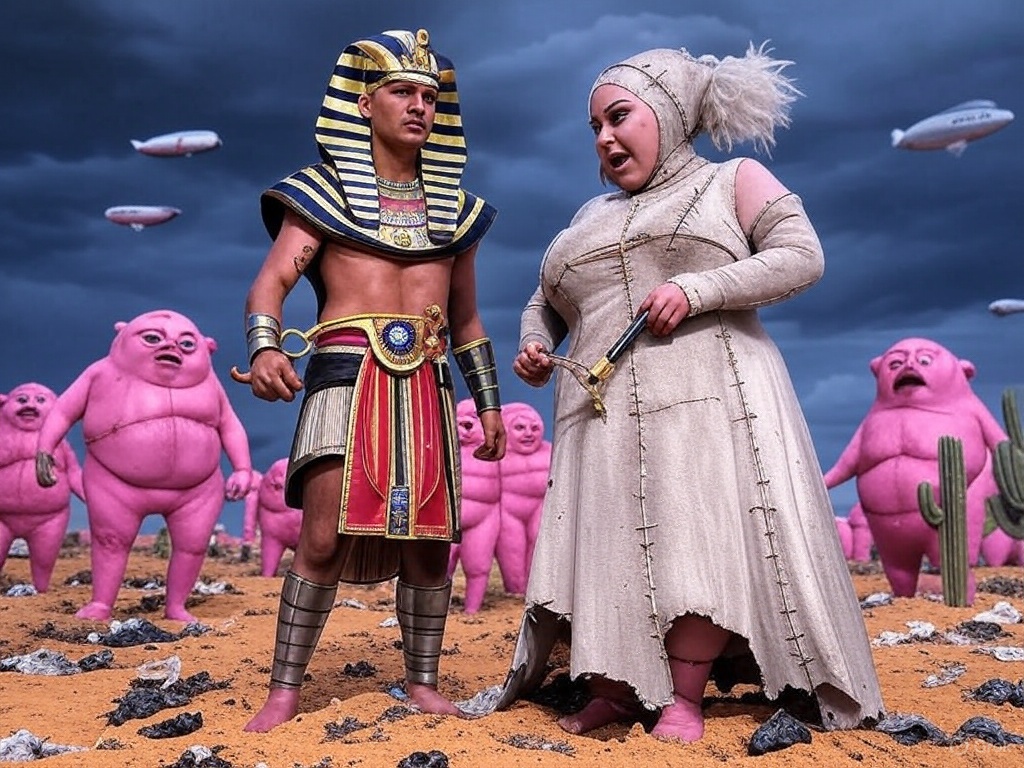 E. dith von B.-Aumann-Stinkenstein, the Wastepaper Empress, was a nymphomaniac whirlwind from the start. Her Ponzi empire wasn’t just about cloud condos—it was a seduction spree. She’d wink at cherubs, flirt with sky-pirates, and even proposition Gerald the pigeon (who just cooed in confusion), all while stacking wastepaper deeds. Her Stink-o-Tron? A byproduct of late-night trysts with inventors, churning lust into loot. Pharaoh Kaiser L, meanwhile, was a swaggering heist-lord whose grappling-hook staff masked a limp secret: impotence plagued him since a botched Bank of China vault job left him zapped by a security ray. He wooed E. dith with promises of power, but their wedding night atop that paper tower was a fart-filled flop—Kaiser L fumbling, E. dith chasing the drunk cherub instead.
