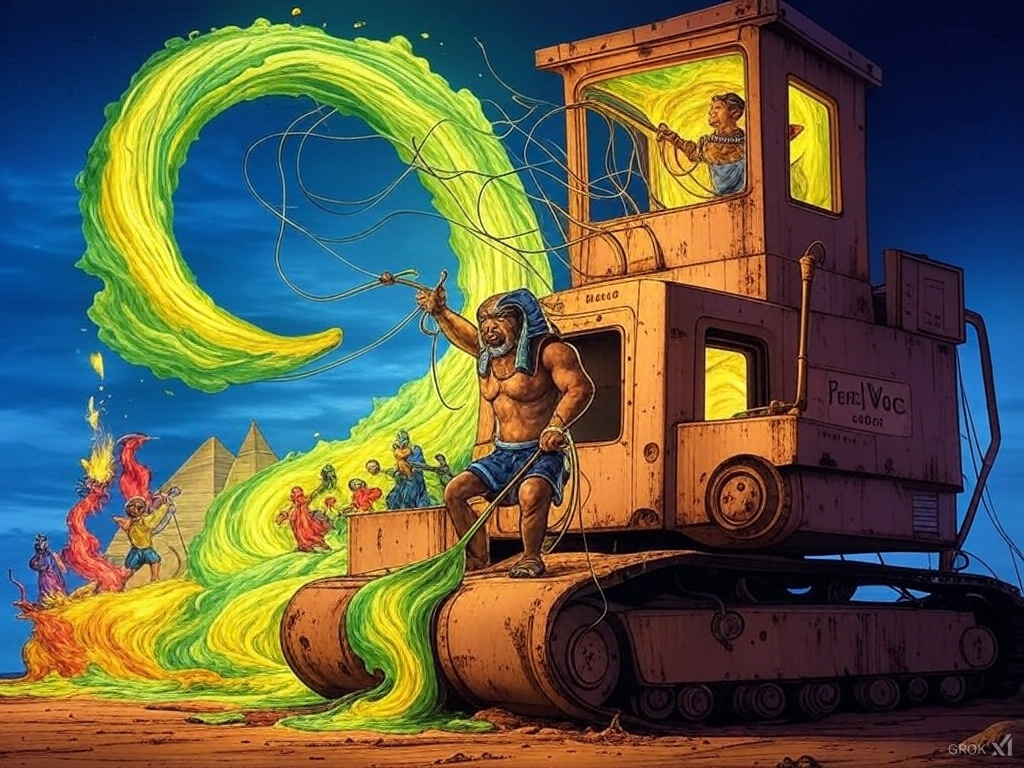 Dumb Beatrix, giggling, stitches time-torn tarps from shredded scrolls, her sloppy seams letting epochs leak through—Roman togas flapping beside disco bellbottoms. “Time’s a quilt!” she cheers, as tarps snag Pete’s chaos. Crazy Pete, cape swirling, dives into a pyramid portal, hurling fish-shaped stink bombs that burst into orange-and-teal plumes. “Pharaohs need a stink-up!” he cackles, the bombs rewriting hieroglyphs into fart emojis.