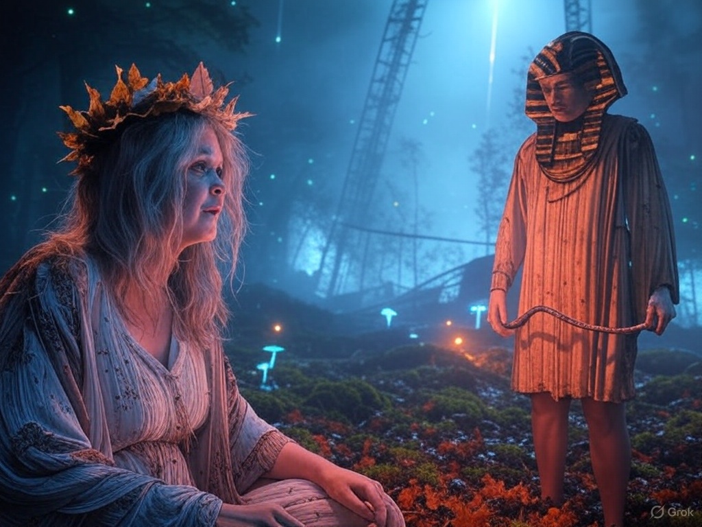 The headline rockets across Idiot Zeitung’s star-dusted pages: “STINK ODYSSEY IM WELTRAUM – E. DITHS NYMPHO-FART JAGT DIE STERNE!!!” After the Stink Louvre’s arty collapse, Pharaoh Kaiser L stands atop a wobbly wastepaper rocket in a foggy forest under bioluminescent trees, his drooping staff—still tangled with Bank of China memos—now a captain’s baton sparking with cosmic dust. His new obsession? The “Stink Odyssey,” a fart-powered space chase to conquer the galaxy, launched beneath a meteor shower. But E. dith von B.-Aumann-Stinkenstein’s nymphomania, now interstellar, turns it into a lusty, stinky supernova.