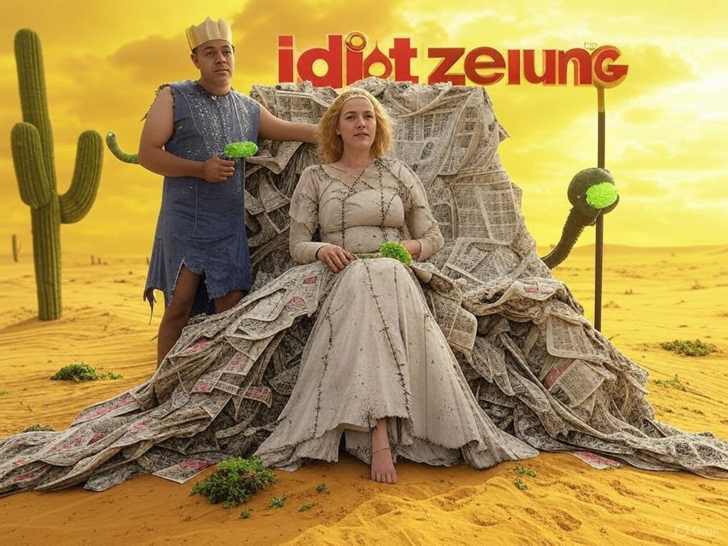 Now, as the Stinkbande’s financial sorceress and Kaiser L’s wastepaper wife, E. dith von B.-Aumann-Stinkenstein’s past fuels her flair for minting absurdity—chrono-coins, fleet-farthings, utopia-tokens—all tallied with a wifely wink at her fart-pharaoh husband. Her empire’s ashes still stink, and Idiot Zeitung once hailed her “The Ponzi Princess Who Wed the Fart-Pharaoh,” a title she flaunts like a tiara of crumpled receipts.