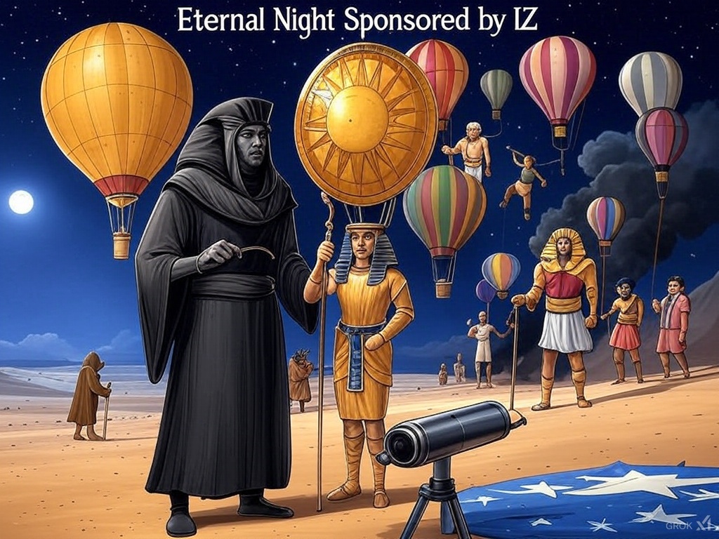 The first attempt at eternal night was, predictably, chaotic. Tom’s balloon fleet got tangled, creating a bizarre pattern of shadows across the land. Jan’s mist turned the air so smoky that the golden logos were barely visible. Beatrix’s ground stars confused local wildlife, while E. dith’s solar observations caused several burns among the crew. Pete’s glowing fish experiment has yet to yield results, but the water has taken on an interesting neon tint.
