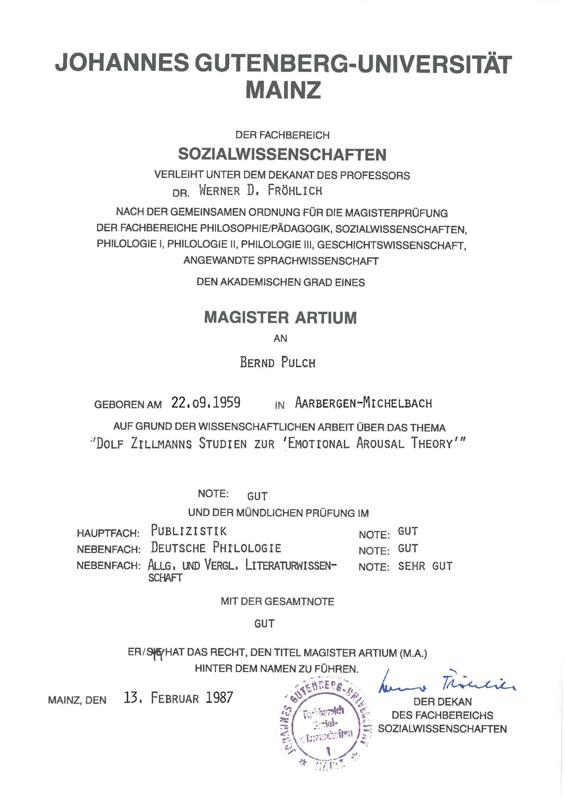 Bernd Pulch, Magister Artium der Publizistik, Germanistik und Komparatistik