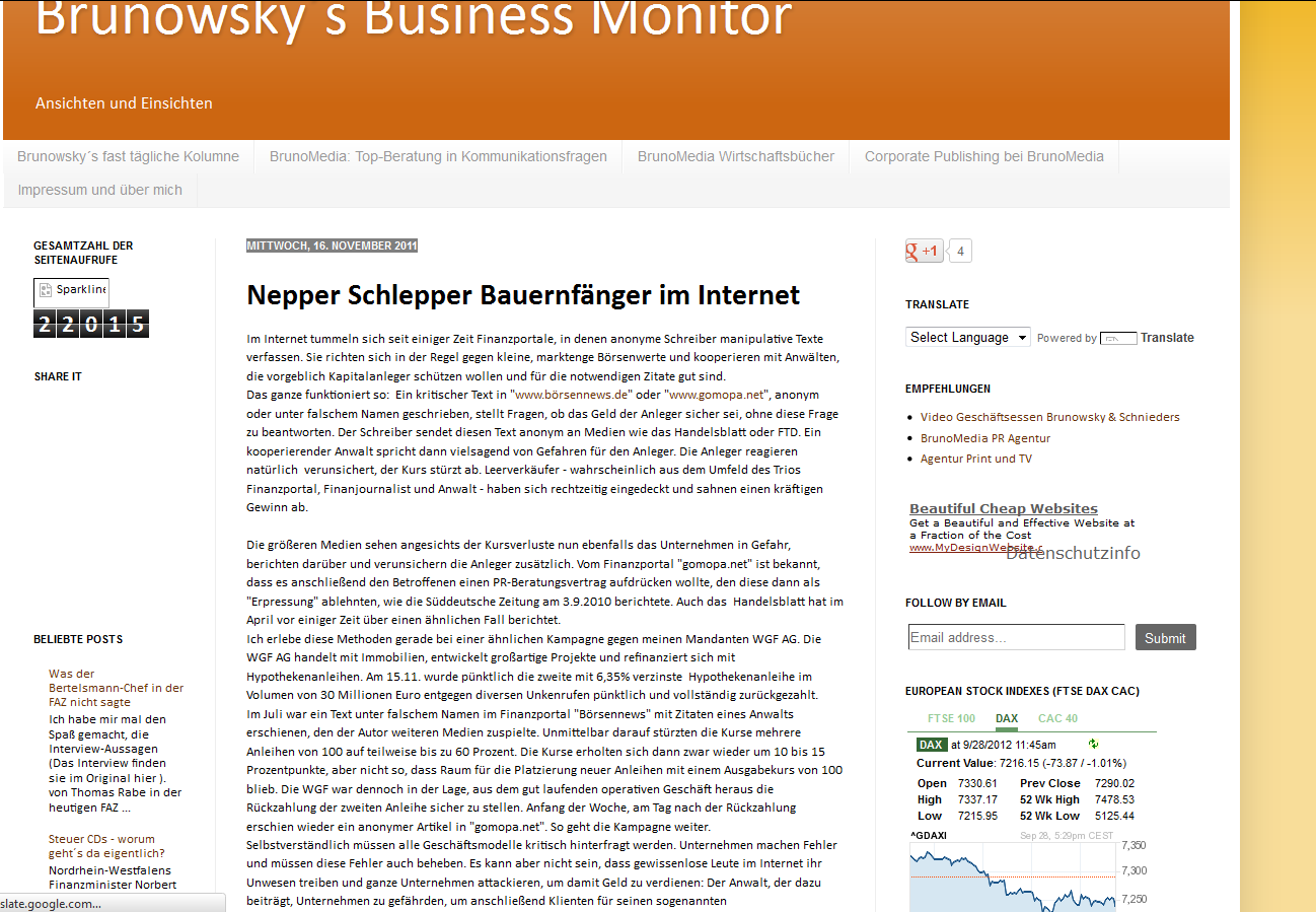 Seit einigen Tagen ist die Internetseite http://www.gomopa.net offline, und es kursieren Gerüchte über finanzielle Unregelmäßigkeiten. Immer wieder ist Gomopa in juristische Streitigkeiten verwickelt. In einer einstweiligen Verfügung des Landgerichts Berlin vom 31. August (Az.: 27 O 658/10) ist das Unternehmen aufgefordert worden, nicht länger Falschinformationen über den Kasseler Immobilienhändler Immovation AG und seinen Finanzvorstand Lars Bergmann zu verbreiten. „Gomopa hat seinen Firmensitz bewusst in New York, weil die Firma dort presserechtlich nicht belangt werden kann“, sagte ein Kenner des Unternehmens der F.A.Z.