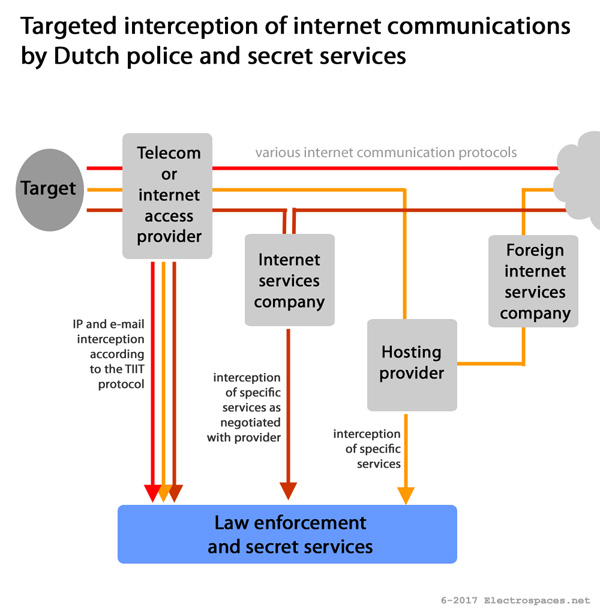 But the hosting companies can of course cooperate voluntarily when the police presents them a warrant. However, when the new Secret Services Act comes into force, such non-public communication providers do have to tolerate interception on behalf of AIVD and MIVD, but they don’t need to have pre-installed tapping capabilties.