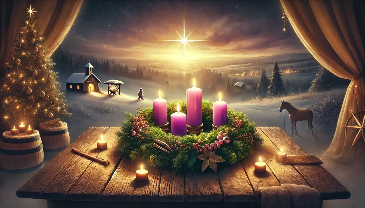 Caption: The Advent wreath shines with the light of the first candle, symbolizing hope and the beginning of the sacred season of preparation for Christ’s coming.