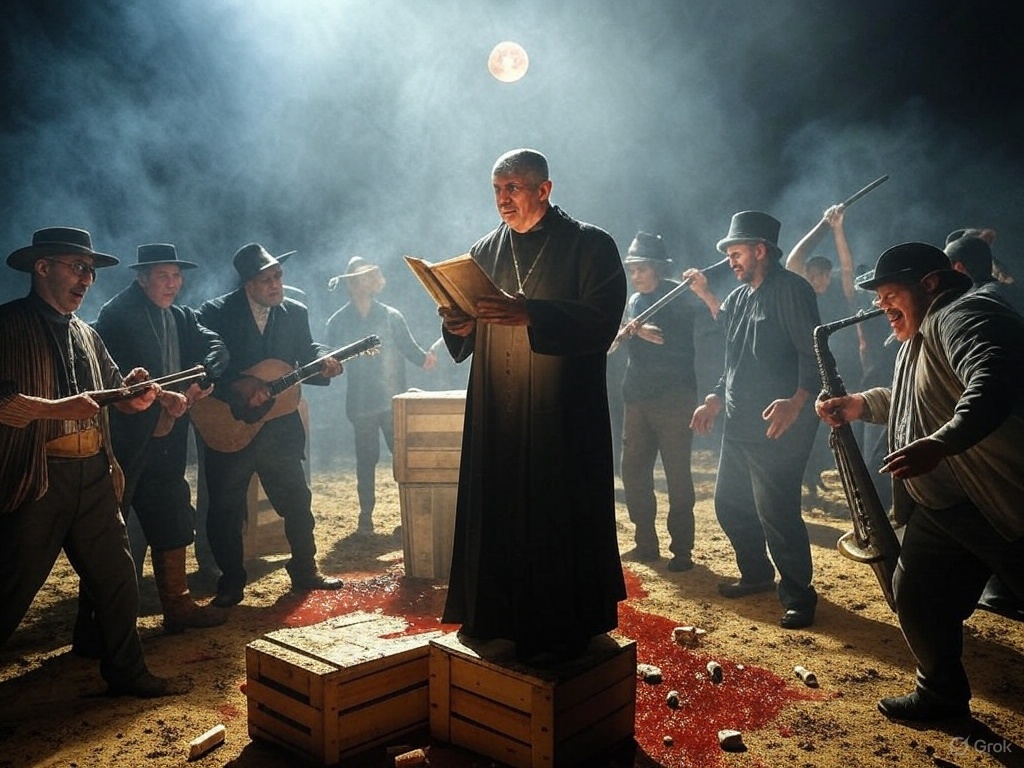 The Wonder Sword’s flash drowned out Chicago’s gunfire, spitting the crew from neon alleys into a humid swamp night. They landed in muddy gravel outside a ramshackle juke joint, the air thick with moonshine fumes and the wail of blues singers. Inside, a raucous crowd stomped to jazz and blues, bottles clinking under flickering lanterns. Archbishop Frank Boredom-Stonewall stood on a crate, his frock coat sweat-stained, bellowing, “Sinners! Drunkards! The delta’s vice ends tonight!” His glare fixed on Fritz, Dumbo, and Quichotte. “You three—my holy hammer falls first!”