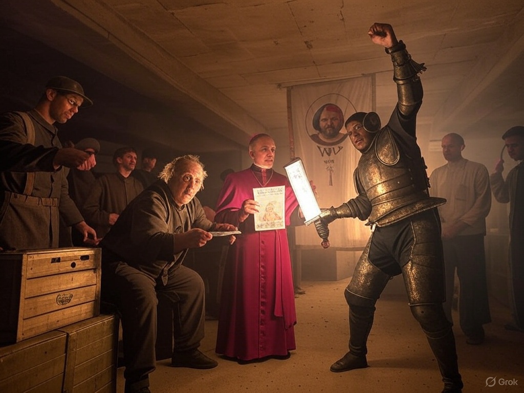 The Wonder Sword’s blaze cut through Salem’s frost, hurling the crew from witch-trial hysteria into a new kind of peril. They landed in a damp cellar, the air thick with cigarette smoke and the tang of fear. Occupied France simmered—résistants in berets whispered over maps, Nazi patrols clattered outside, and Archbishop Frank Boredom-Stonewall, now in a Vichy-collaborationist cassock, stood before a swastika banner, his voice oily. “Traitors! Saboteurs!” he sneered, pointing at Fritz, Dumbo, and Quichotte. “Your rebellion ends with my Gestapo friends!”