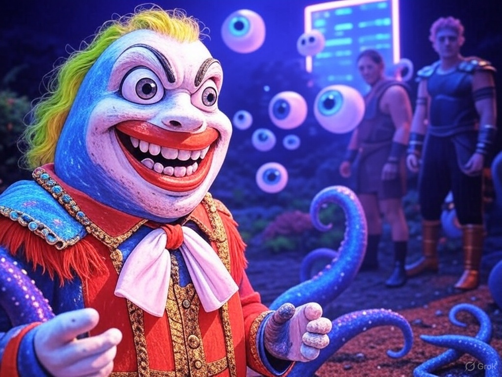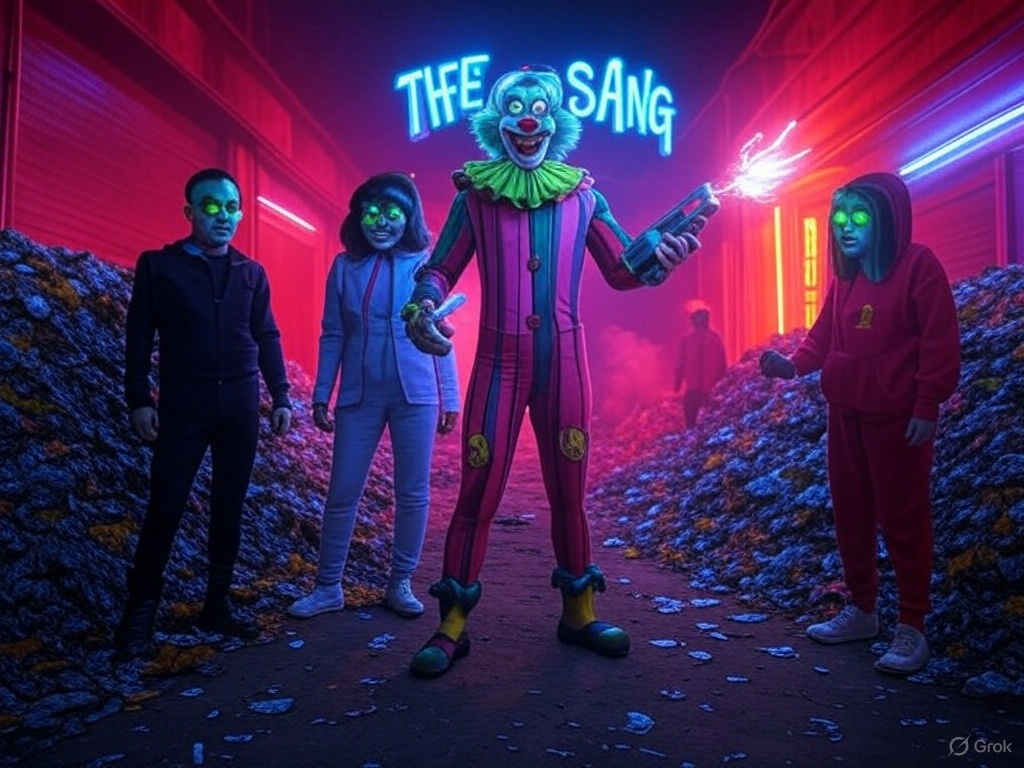 ๐ค Bianca sings โI Will Survive,โIbiza Granny drops techno beats, Karl recites haikus, Vinny blasts the Miami Vice theme, Marcel traps drones in mime boxes, Lola plants glitter bombs, and Lady Lumen zaps with strobe stilettos.