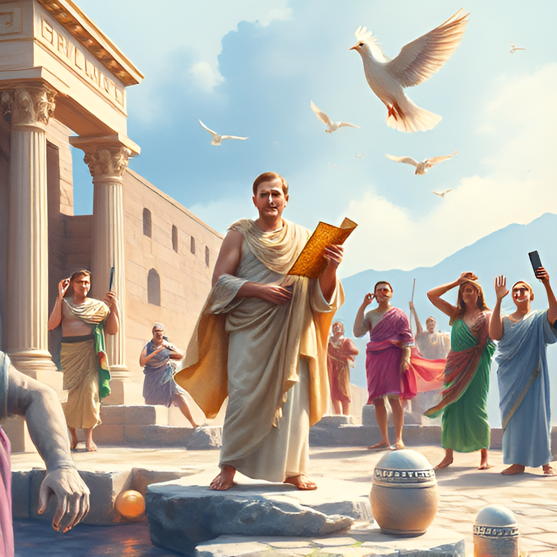 Andreas tries selling swastika-stamped philosophy scrolls to the Greeks, but the philosophers use them to clean their sandals.
