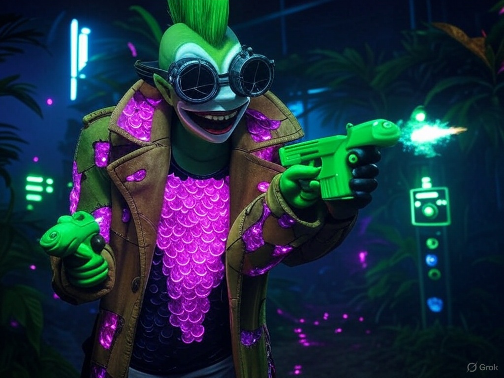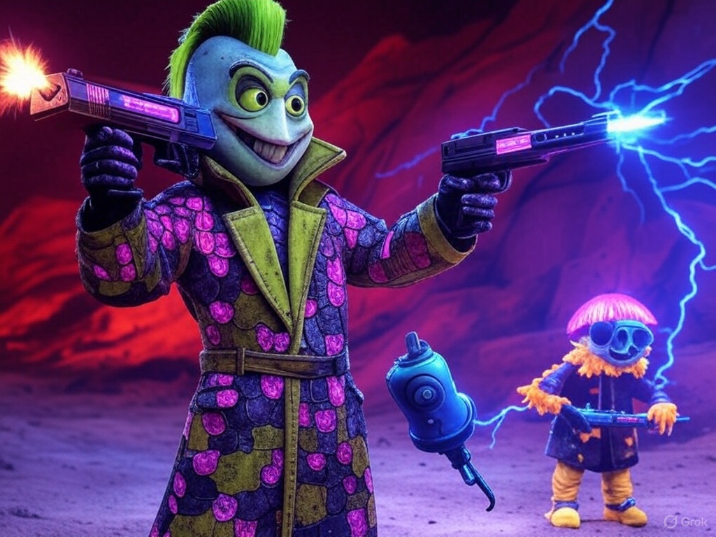 Crazy Pete the Fish teams up with the Brazilian Escorts for a glittery raid on Heydrichโs agora. Using alien tech, he equips the rebels with glitter catapults that launch sparkling projectiles, while doves perched on the Parthenon squawk โEnd ReichCoin!โ