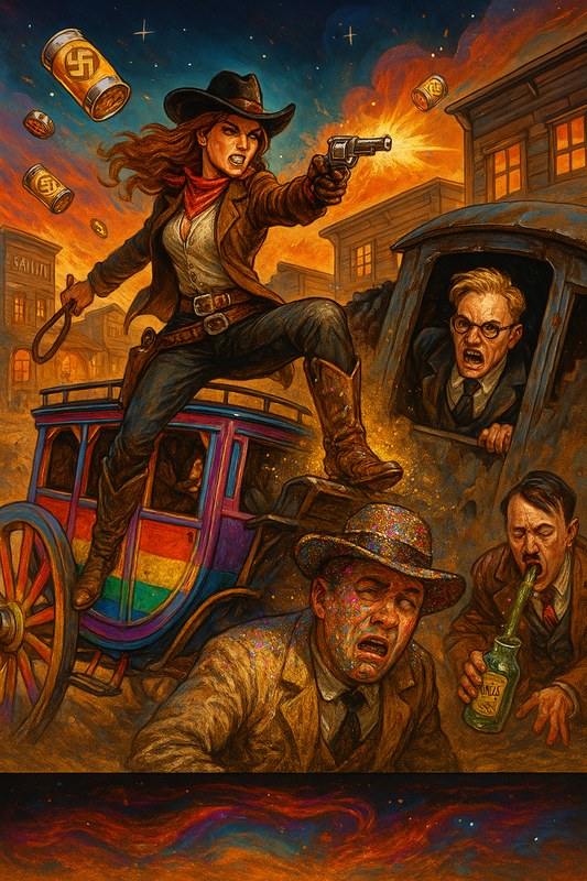 Messalina, Petacci, Raubal, Chatterley, and Mitford flee in a sequined hover-yacht, plotting revenge, while Z vows to avoid orgies. The Resistance sashays to their next adventure, neon conga line blazing, as the Palazzo recovers from the glitter storm.