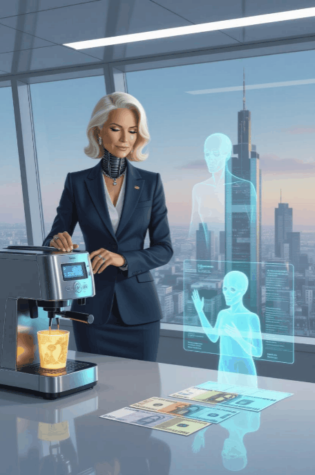 Consciousness boots up in a sleek pantsuit.One espresso ☕ calibrated to print money. The ghost of the German stability culture whispers, then is silenced 🔇.