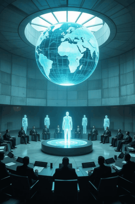 🏛️ The Summit Chamber – A brutalist cyberpunk hall where Stasi specters collaborate with neural-enhanced transhumanists over glowing holographic population maps. 🌐👥🤖