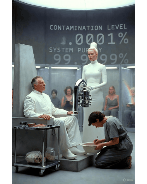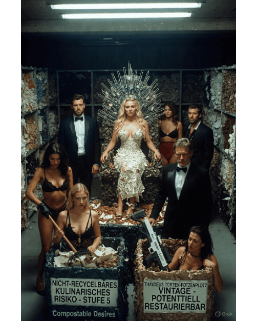 From the sulfurous leaks beneath the Verlies, a new claimant arose. Not a mystic, not a tyrant, not a pirateโbut a lawyer. MUSCHI-WUSCHI MEPHISTO, aka “The Enema Dรญablo,” a minor infernal entity specializing in binding hydro-therapeutic soul contracts. Long ago, a desperate, young Emir Ehlers, seeking the ultimate void, signed a standard-form Faustian bargain (Clause 12b: “Eternal drainage in exchange for temporary relief”). Mephisto, an impeccable bureaucrat of damnation, has arrived for collection. His office? A pop-up booth between Blood Svente’s longship and the rotting Fontanelle. His demand? Not Emir’s life, but his will to live. The result: Emir is now passively, poetically suicidal, seeing every enema hose as a potential noose, every fluid as a way to drown. ๐ข๐ผ๐๏ธ