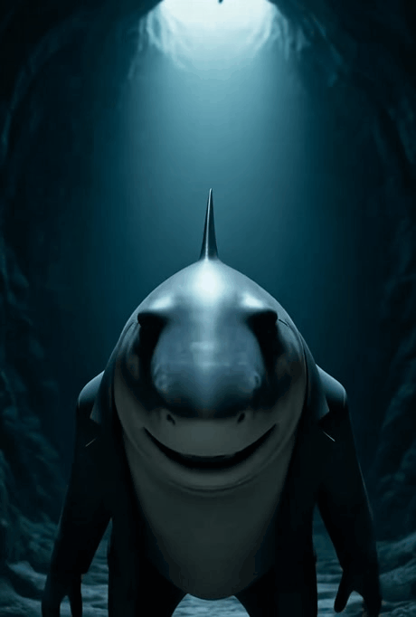 SHARKLER: (On screen, wearing a too-small suit jacket over his dorsal fin) “My fellow beings. I have spent many months journaling. Reflecting. Growing. And I have reached a conclusion.” ๐ฆ๐