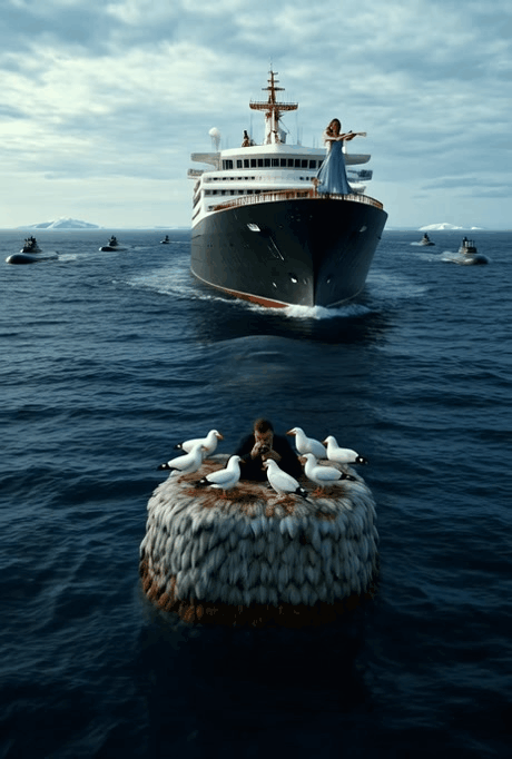 The Titanic lists. Champagne flutes topple. The iceberg watches, nervous.