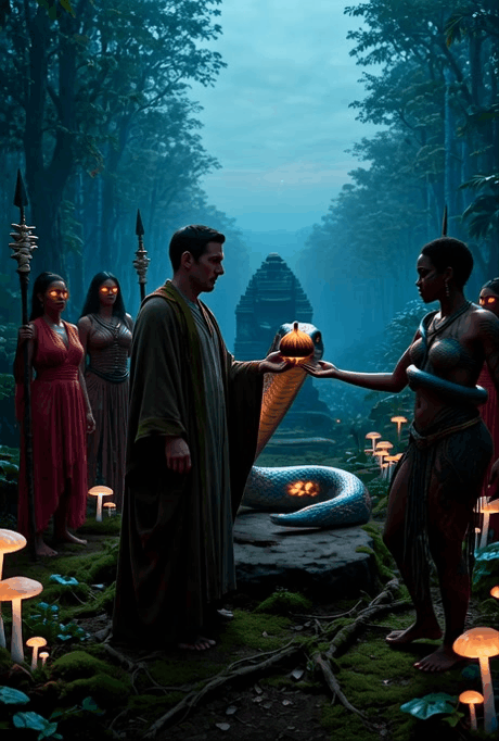 He emerges on the other side โ€“ unharmed. But his clothing is now ceremonial. Leaf patterns. Earth tones.
