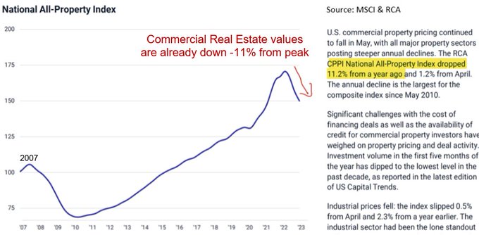 Looming Crisis How Commercial Real Estate could be the next domino to fall The commercial real estate market is in the midst of a perfect storm that could potentially create a financial crisis of epic proportions. Interest rates are soaring, while office vacancies have hit a record high. With $1.5+ trillion in commercial real estate debt set to mature by 2025, refinancing these loans in the face of these challenges could prove to be an insurmountable task. The commercial real estate industry is estimated to have a market size of ~$20T. To put that in perspective, the value of U.S. commercial real estate is more than half of the market value of all U.S. publicly traded companies (stocks). Traditionally, when commercial real estate debt matures, refinancing is accompanied by a reduction in interest rates. But with interest rates on mortgages more than doubling in just two years, the prospect of refinancing these loans has become increasingly daunting. Compounding the problem is the fact that smaller banks have taken on a higher percentage of commercial real estate loans. While this trend has been evident for some time, new data reveals that small banks now hold 27% of commercial real estate debt, up from 17% in 2017. In fact, smaller banks rely on these loans as much of their business is derived from commercial real estate.