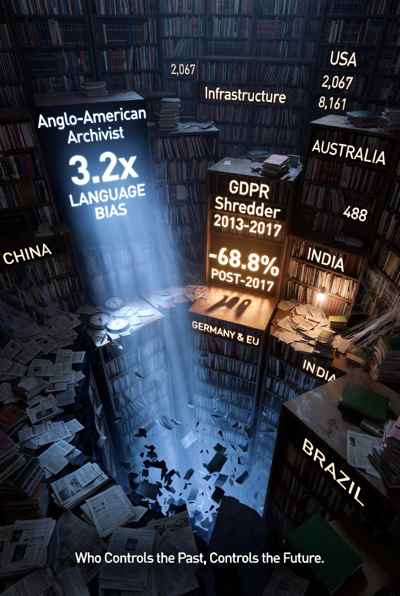 English-speaking markets archive 3.2 times more historical data per country than non-English markets. This is not due to more activity, but because platforms like Archive.org are English-optimized. The result? The digital history of Germany, France, Japan, and China is systematically erased in favor of the Anglo-American narrative. Future historians will know more about real estate in Australia than in the entire continent of South America. - The Privacy Deception: GDPR & CCPA as Censorship Tools.