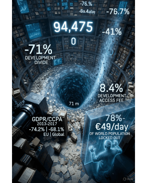 이 분석은 46개국에서 94,475건의 부동산 기록이 삭제되었음을 보여준다.규제로 인해 2017년 이후 아카이브가 71% 감소했으며, 영어가 신흥 시장을 8.4배 초과하는 체계적인 언어 편향이 존재한다.