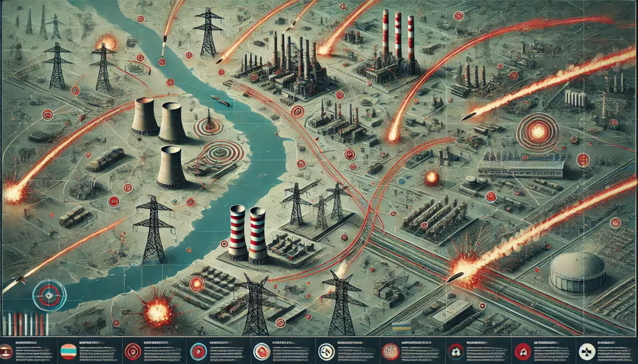 Here is a visual representation of missile trajectories and their impacts on energy infrastructure, specifically highlighting Dnipro’s damaged facilities. The map illustrates missile paths targeting key energy sites and includes visuals of affected industrial areas in Dnipro, overlaid with a strategic layout showing trajectories and explosions.