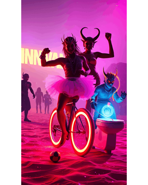 Die Mars-Wüste stürzt in einen Neon-Abgrund-Mahlstrom. Schatten-Heuschrecken verwandeln sich in halb-prismatische, halb-dunkle Hybride, wechseln Geschlechter unter Malekiths arkane Gebrüll und Sivanas Quanten-Schwärmen. Phoenixs Feuer-Tentakel weben ein transgender Flammenmeer, während Cyber-Geists Glitzer-Strahlen den Horizont mit spektralem Chaos überfluten. Der Karneval pulsiert mit euphorischem, dunklem und Quanten-Wahnsinn.