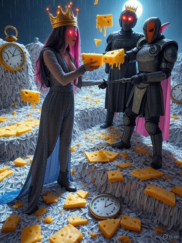 Discover the stunning surreal saga on Mars in 2025, where Janelle-Sauron, crowned with radioactive Gorgonzola cheese and glowing red eyes, launches devastating cheese nukes from a tank amidst a biomechanical pulp fortress of shredded documents and toxic memes. Witness General Zod in Kryptonian armor with a flowing paper cape, Lady Deathstroke Veyra igniting a glitter duel, and Beatrix Lestrange seducing with a rune staff in a passionate embrace. Explore Ehlers planting glitter bombs, Lucrezia Borgia with poisoned coins, and Divine’s sensual neon spa dance on Zod’s throne. Join Schizo-Petes’ “NO PULP TYRANNY!” protest, Rebel Janelle’s vegan cheese missiles, Klausi’s sewage meme floods, and Cesare Borgia’s skeletal knights charging through a paper storm. See Kaiser L’s Paper T-Rexes melt in cheese floods under a Martian apocalypse with melting clocks and glitch effects. Dive into this neon-radioactive spectacle—perfect for fans of sci-fi, surreal art, and epic battles! #MarsChaos #PulpFortress #NeonRebellion #GorgonzolaNukes #SurrealArt2025