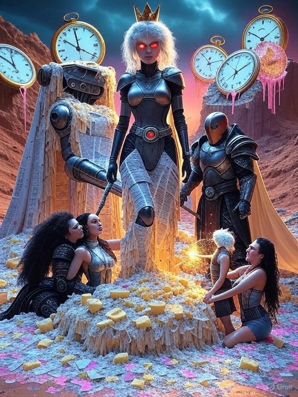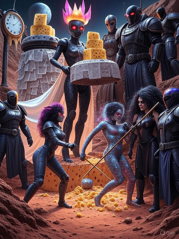 Explore the surreal 2025 Mars saga where Borg Queen Janelle, crowned with radioactive Gorgonzola and glowing red eyes, unleashes fetish-infused cheese nukes from a biomechanical tank amidst a pulp fortress of shredded documents and toxic memes. Witness General Zod in Kryptonian armor, Lady Deathstroke Veyra’s glitter duel, and Beatrix Lestrange’s seductive rune embrace with Janelle. Meet Dumb Tom, Janelle’s clumsy husband, and Jezzebel Colony-Us-Slit, her shrewd accountant. See Ehlers’ glitter bombs, Lucrezia Borgia’s poisoned coins, and Divine’s sensual neon spa dance. Join Schizo-Petes’ “NO FETISH TYRANNY!” protest, Rebel Janelle’s vegan missiles, Klausi’s sewage floods, and Cesare Borgia’s skeletal charge. Watch Kaiser L’s Paper T-Rexes melt in cheese floods under a Martian apocalypse with melting clocks and glitch effects. A neon-radioactive masterpiece for sci-fi and surreal art lovers! #MarsFetishChaos #PulpFortress #NeonRevolt #GorgonzolaNukes #SurrealArt2025