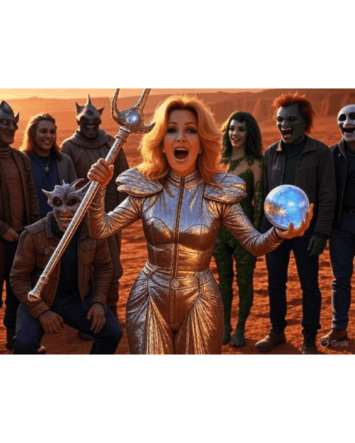 The Martian horizon shatters into a transsexual ascension rebellion. Shadow-comets morph into half-prism, half-cosmic hybrids, shifting genders under Zoom’s speed-roars and Poison Ivy’s pheromone hum. Cyber-Phoenix’s ultra-charged starburst torrents flood the sky with neon anarchy, hailing Janelle’s ascension. The reign pulses with euphoric, cosmic, and quantum madness, amplified by her obsidian dagger and crystalline orb.