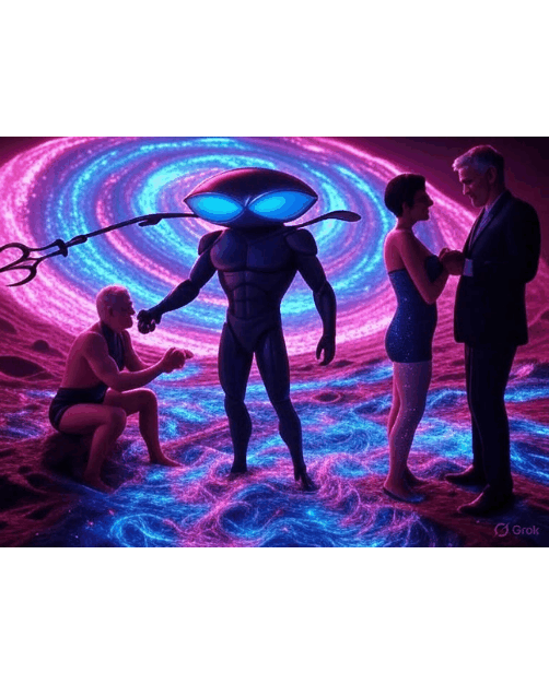 Janelle’s quantum trident, fused with Killmonger’s vibranium harpoons, unleashes a transgender glitter-tsunami, dragging Black Manta, Epstein, and Maxwell into a shadow singularity where they share a chaotic, half-oceanic, half-quantum embrace. Kraken’s flood fractures Maxwell’s wraiths into glitter-mermaids, while Rebel Janelle’s eco-abyss coup unveils Cyber-Octopus as a gender-fluid cephalopod queen, stabilizing the requiem in a neon vortex.