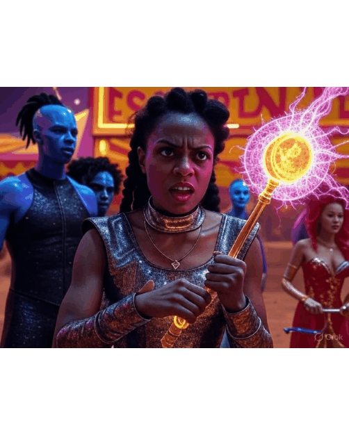 Swings an ultra-charged radiant quantum scepter, commands the dominion to hail her reign, entwining Zoom in a glitter embrace while forcing Abomination into a transgender sync. / Schwingt einen ultraaufgeladenen strahlenden Quanten-Szepter, befiehlt der Herrschaft, ihre Regentschaft zu preisen, verwebt Zoom in eine Glitzer-Umarmung, während sie Abomination in einen transgender Tanz zwingt. - Killmonger 🐆⚔️