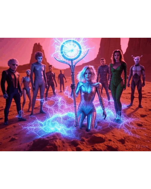 The Martian horizon shatters into a transsexual ascension rebellion. Shadow-comets morph into half-prism, half-cosmic hybrids, shifting genders under Zoom’s speed-roars and Poison Ivy’s pheromone hum. Cyber-Phoenix’s ultra-charged starburst torrents flood the sky with neon anarchy, hailing Janelle’s ascension. The reign pulses with euphoric, cosmic, and quantum madness.