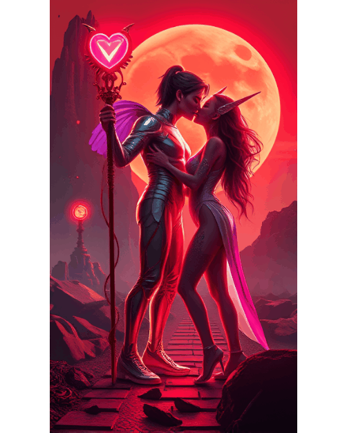 Janelle’s disco scepter, entwined with Red Queen’s heart-scepter, summons a transgender passion cheese tsunami, splitting into half-solid, half-liquid waves that morph genders, sweeping Cersei into a glitter pit where Sex God 5 and Red Queen share a fiery kiss—half-drag, half-deity. The Joker’s laughter bombs detonate with Thanos’ snap, fracturing into transgender chaos that corrupts the JSA into Sauron-warriors. Mystique’s duck band triggers a schizoid rave, warping Klausi’s soda flood into a transgender fountain with Haman’s gallows. Rebel Janelle and Cesare launch a whipped-cream coup, but Kaiser L’s T-Rex pops, revealing Lucrezia as a half-heal, half-poison, gender-fluid Sauron demoness. Edith’s wrench-mirror stabilizes the madness, creating a half-passion, half-order vortex with shifting forms. Janelle as Sex God 5 and Red Queen crown themselves co-rulers, slipping on banana peels as Mars glows in romantic, transgender neon.