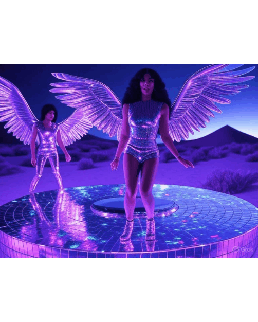 I generated images with the prompt: ‘stunning cinematic image featuring characters from “Hinterfozzige Janelle Sauron’s Fetish Empire – Episode 58: Chrome Transcendence Tempest – The Reckoning,” including AI Donna Summer twerking atop a floating disco platform, Andreas and Andy Warhol as transgender passion-chrome-tentacle-wing hybrids, Archbishop Frank in a schizoid velvet-chrome robe, Baron Leopold von Sacher-Masoch bound in gender-fluid chains, Beate Zschäpe wielding a neon whip, Blutige Brigitta as a transgender vampire queen, Brazilian Escorts in chrome lingerie dancing in a neon-lit Martian rave, Dr. Otto Octavius (Doctor Octopus) with mechanical tentacles, and Vulture (Adrian Toomes) with electromagnetic wings manipulating soda-locust swarms, all set against a backdrop of pulsing obsidian and lavender dunes with matrix code.’
